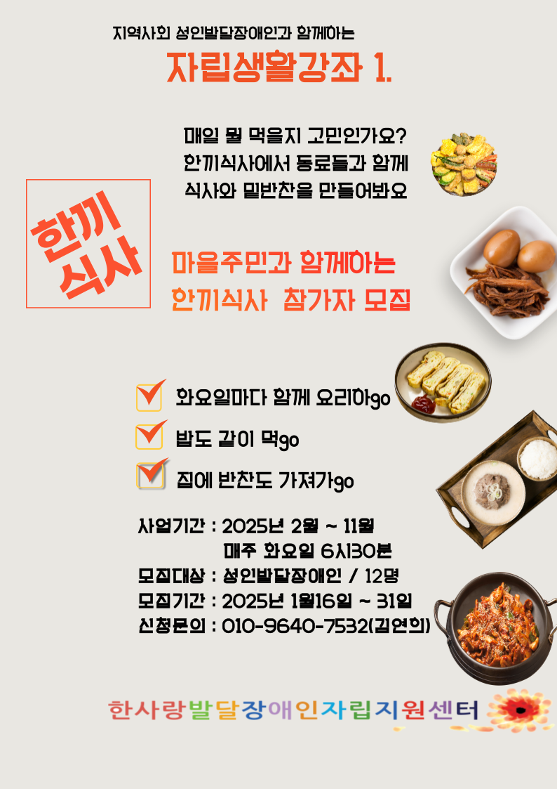 <공지> "한끼 식사와 반찬 만들기" 자립생활강좌 1 참여자 모집 홍보 최고관리자 0 878 01.17 10:30 "한끼 식사와 반찬 만들기" 자립생활강좌 1 참여자 모집 홍보포스터