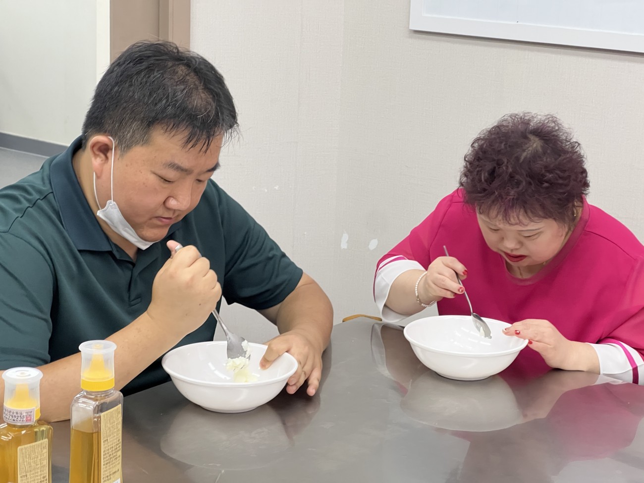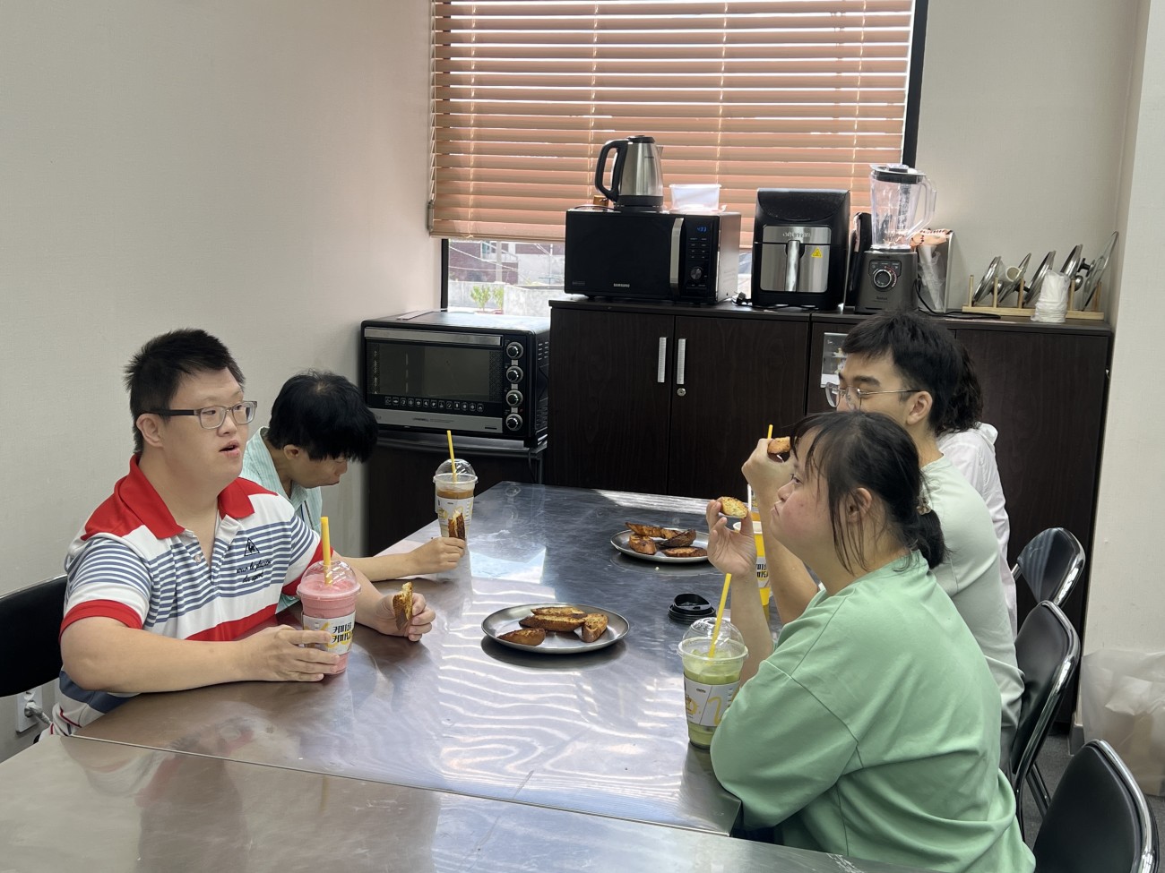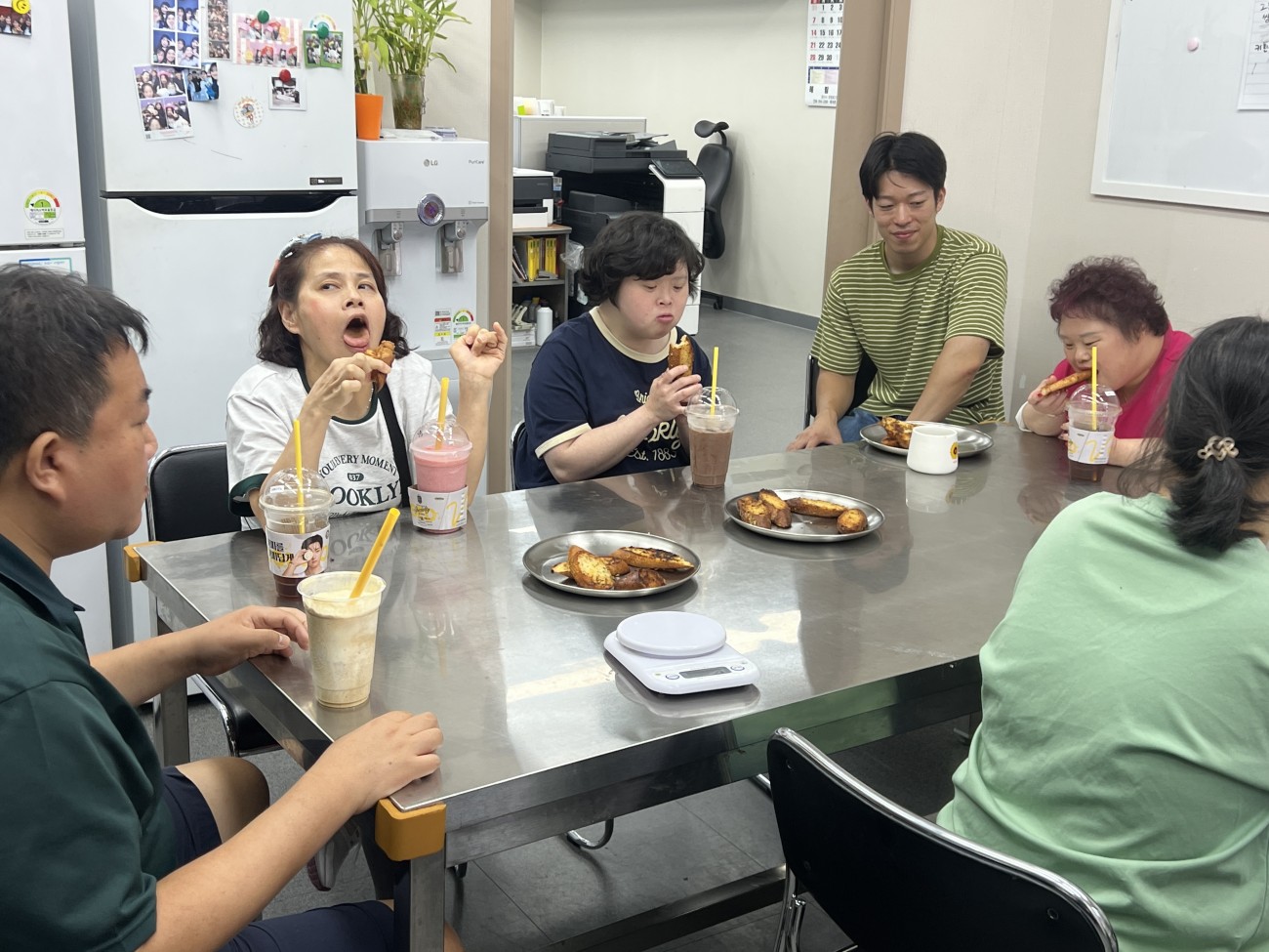 25년 9월6일 자조모임- 제빵1 최고관리자 0 149 09.09 12:23 마늘빵을 만들기로 했습니다.재료를 사서 마트에 가서 장을 보았습니다.버터를 칼로 자른 다음에 저울을 올려놓은 다음에 3개를 올려서 몇그람인지 맞추었습니다.월에 버터를 넣어서 나눠주었습니다.숟가락으로 눌리거나 휘젓어주었습니다.전자레인지에 1분을 녹였습니다.꿀을 숟가락을 넣고 꿀을 2번 넣었습니다.마늘을 적당히 넣고 숟가락으로 휘젓고 파슬리를 뿌렸습니다.빵을 구워서 음료수랑 같이 먹었습니다.