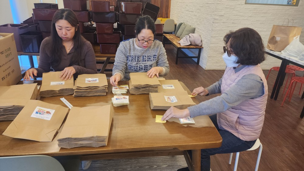 김치통에다가 스티커를 하나씩 붙여서 박스에다가 김치통을 넣어놓고나서 테이프로 박스를 붙였습니다.
