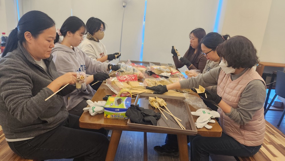 무를 잘라서 볼에다가 무를 자른 것을 담기도 하고, 어묵비닐봉지를 뜯기도 하고, 쟁반에다가 담긴 어묵꼬지를 꽂아서 비닐을 씌우고 나서 꽂은것을 하나씩 넣었습니다.