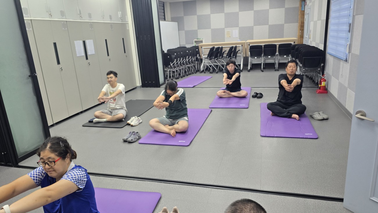 요가매트에 앉아서 다리를 이쪽에서 저쪽으로 풀기도 하고, 저쪽에서 이쪽으로 풀기도 했습니다.