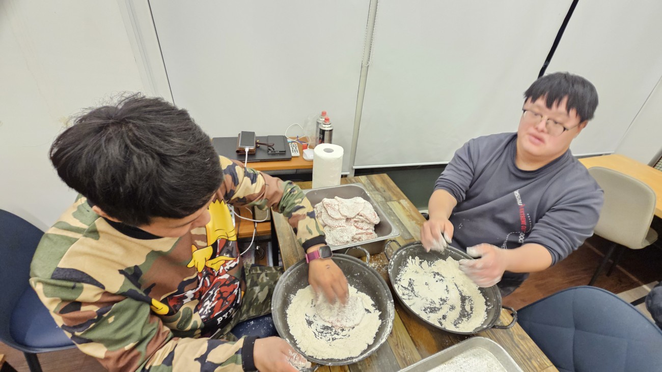 휴대용 버너랑 작은 웍을 가지고 와서 큰 식용유랑 빵가루랑 계란물이랑 밀가루에 묻힌 돈까스를 준비해놓고 손으로 돈까스를 빵가루를 묻힌다음에 계란물을 묻히고 나서 그다음에 웍에 돈까스를 하나씩 넣은것을 작은쟁반에다가 꺼내서 다시 튀겼습니다.
