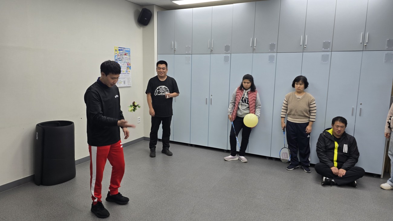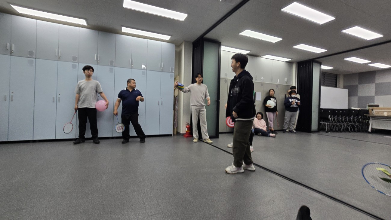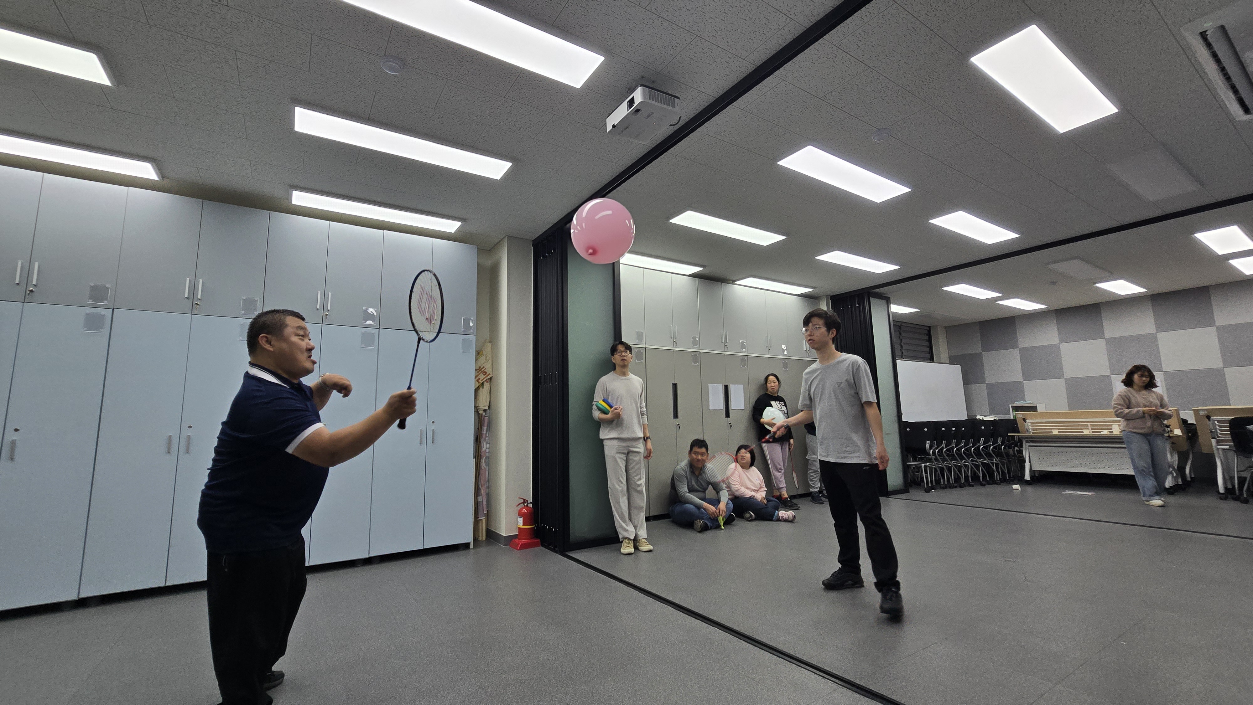풍선가지고 배드민턴채를 잡고 연습을 했습니다.