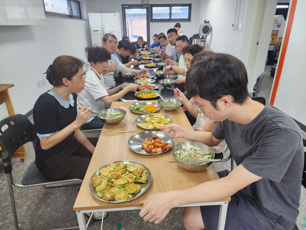 오늘의 메뉴는 삼계탕, 단무지무침, 비엔나소세지볶음, 애호박전, 후식은 귤, 아이스크림을 먹었습니다.