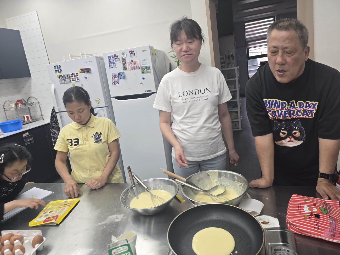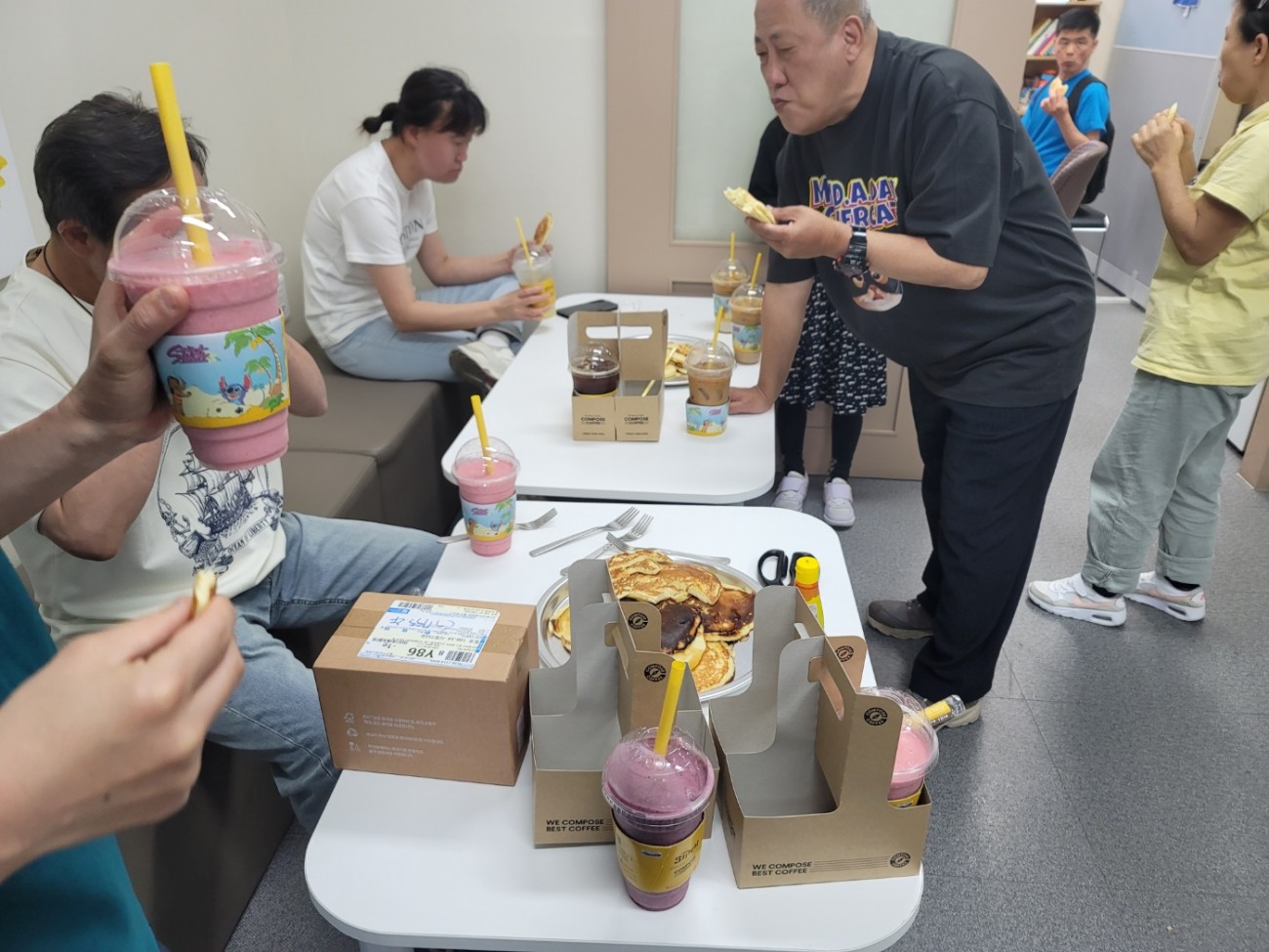 25년 5월31일 자조모임-제빵2 최고관리자 0 462 06.18 11:26 25년 5월31일 오후1시미트에 가서 재료 핫케이크믹스 계란넣고 우유넣고 시럽 계산하고 샀다.다시 한사랑 2층에 와서 동료들과 같이 핫케이크 만들어 먹었습니다.카페가서 동료들하고 나눠먹었습니다.다음달은 토스트 만들예정입니다.