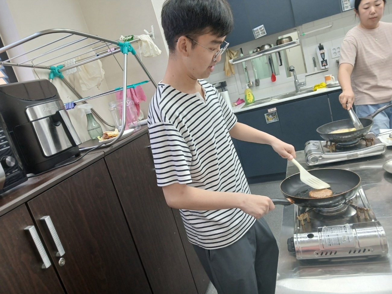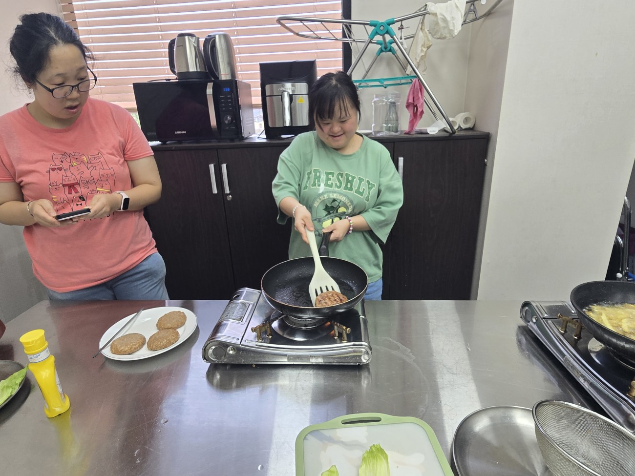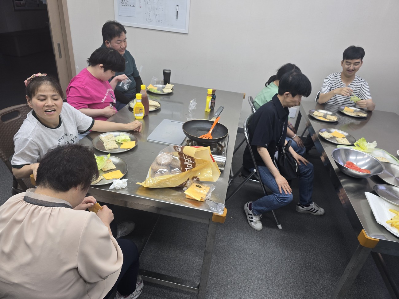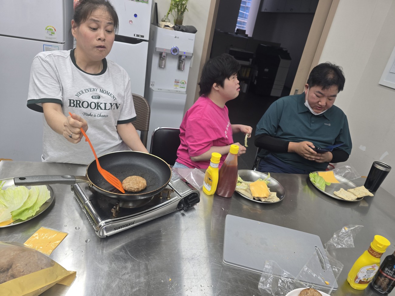 25년 6월7일 자조모임-제빵1 최고관리자 0 445 06.18 14:14 25년 6월7일 오후1시마트에 가서 양상추,토마토,양파,슬라이스치즈,함박스테이크,머스타드 소스,함박스테이크 소스도 사고, 감자튀김, 치즈스틱도 사고, 음료수는 환타랑 콜라도 사고, 모닝빵이 없어서 다른 빵을 샀습니다.함박스테이크는 해동을 하고 나서 각자 구워서 함박스테이크를 후라이팬에 구워서 각자 동료들이 만들어서 햄버거를 만들어 먹었습니다.