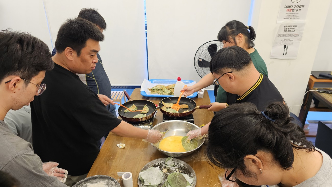휴대용 버너랑 후라이팬을 가지고 와서 밀가루랑 깻잎이랑 계란을 가지고 와서 깻잎을 밀가루를 묻힌다음에 깻잎 소를 넣고 계란물을 묻혀서 식용유를 후라이팬에 넣고 나서 깻잎전을 만들었습니다.
