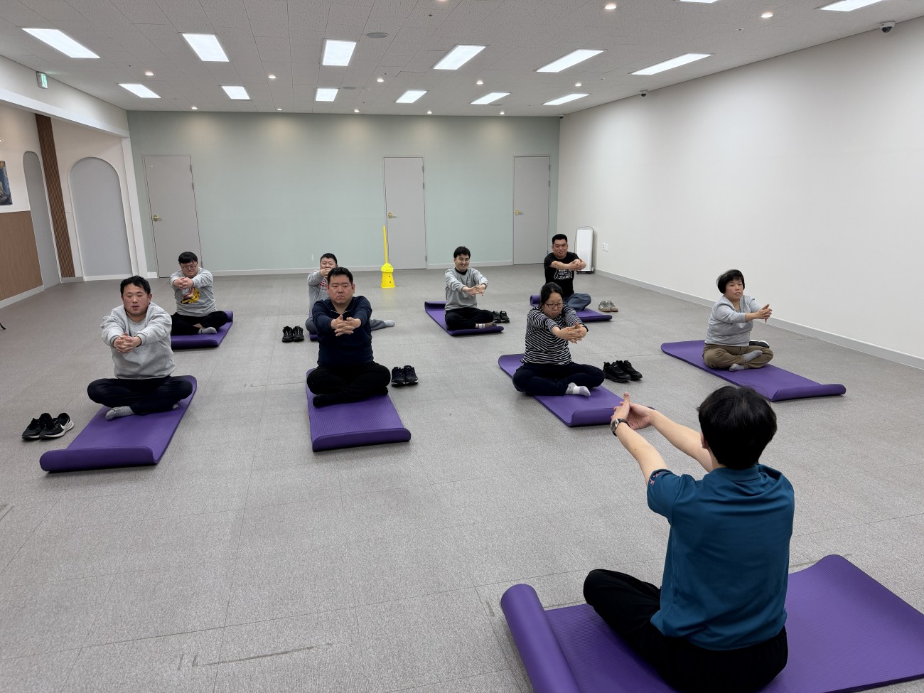 요가매트에 앉아서 다리를 굽혔다가 펴기도 하고, 각 다리를 굽혔다가 펴기도 하였습니다.